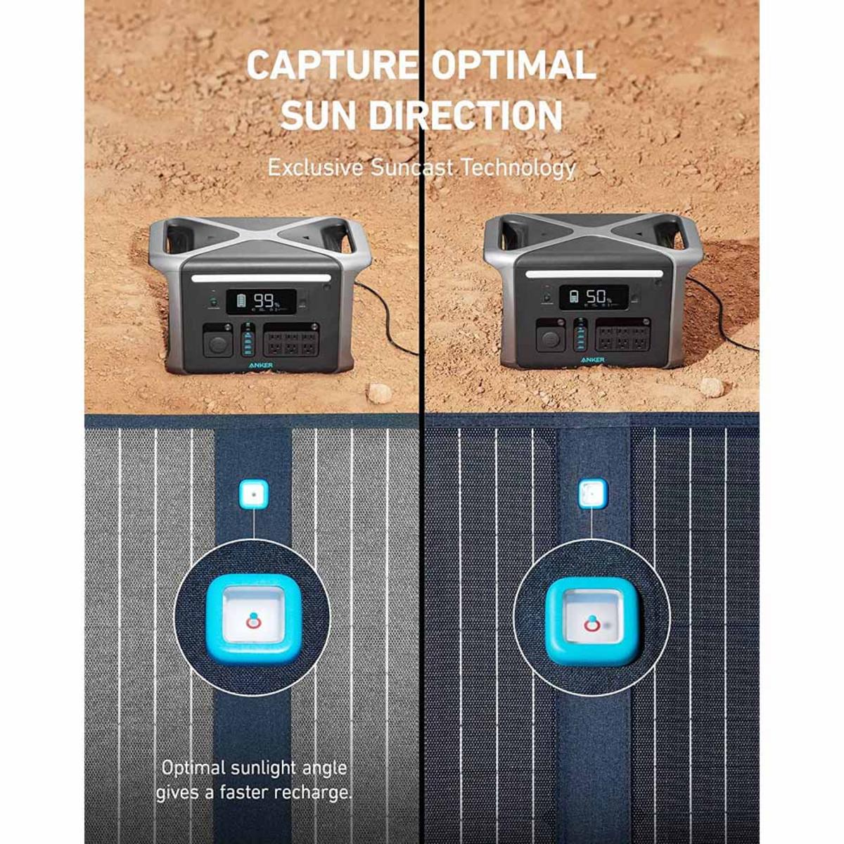 - Smart Sunlight Alignment: Equipped with Anker's proprietary Suncast technology, adjust the solar panels properly to capture direct sunlight for maximum charge.